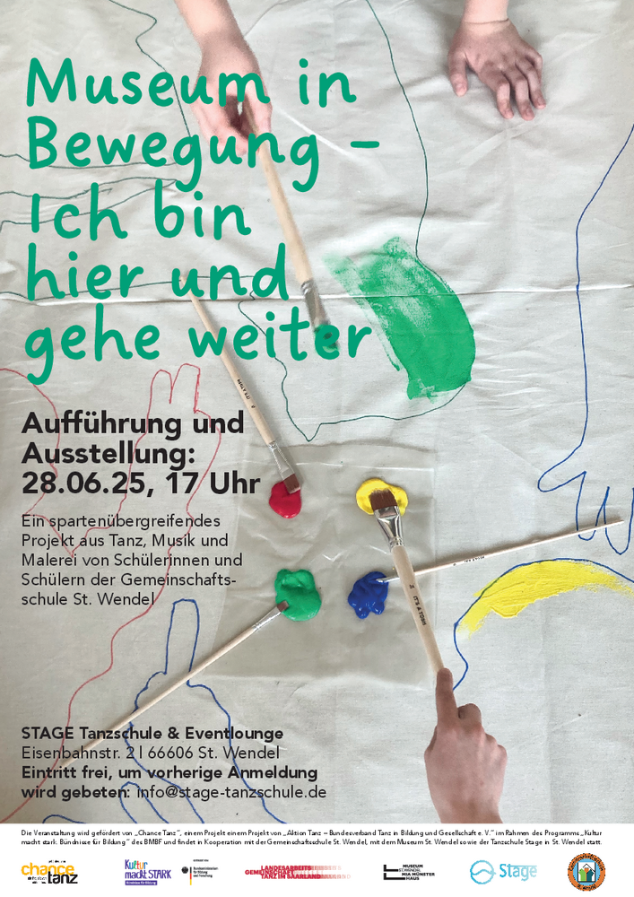 „Museum in Bewegung – Ich bin hier und gehe weiter“ ist ein gemeinsames Projekt der Gemeinschaftsschule St. Wendel, des Museums St. Wendel, der STAGE Tanzschule & Eventlounge und der Landesarbeitsgemeinschaft Tanz im Saarland e.V. Gefördert im Rahmen von „ChanceTanz“ des bundesweiten Programms „Kultur macht stark. Bündnisse für Bildung“ des Bundesministeriums für Bildung und Forschung.
