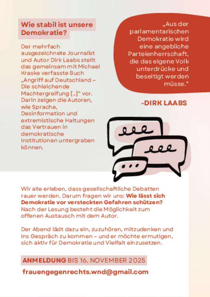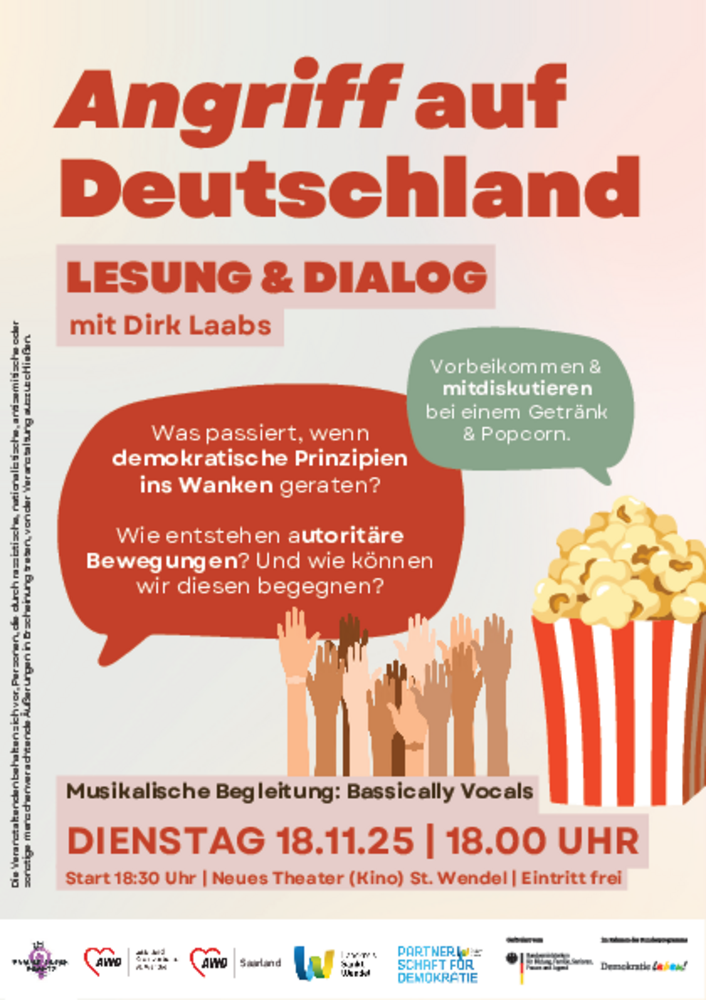 Die Veranstaltung findet am 18.11.2025 ab 18:00 Uhr im Neuen Theater (Kino) St. Wendel statt. Geplant ist zunächst die Autorenlesung von Dirk Laabs, musikalisch begleitet vom Duo Bassically Vocals mit kritischen Texten. Im Anschluss daran findet eine moderierte Diskussions- und Austauschrunde zwischen Autor und Publikum statt.